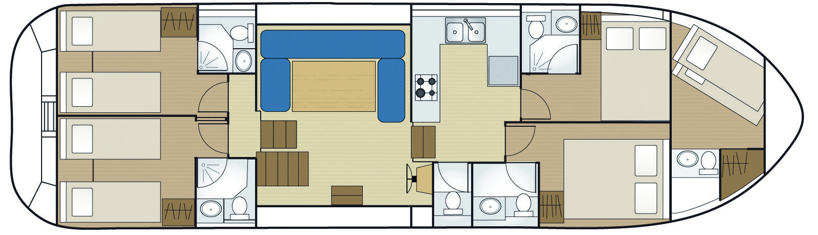 - 2 cabines à l’avant, chacune avec lit double; 2 cabines à l’arrière, chacune avec 2 lits simples convertibles en lit double; petite cabine de proue avec deux couchettes, un lavabo et un WC (accès par l’extérieur, à réserver à des adolescents).