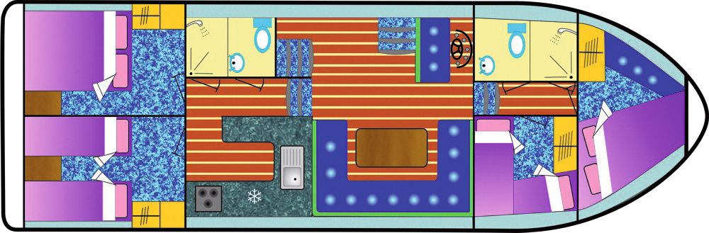 - Cabine avant avec lit double, cabine latérale avec 2 lits superposés; 2 cabines à l’arrière, l’une avec lit double et l’autre avec 2 lits simples convertibles en lit double.