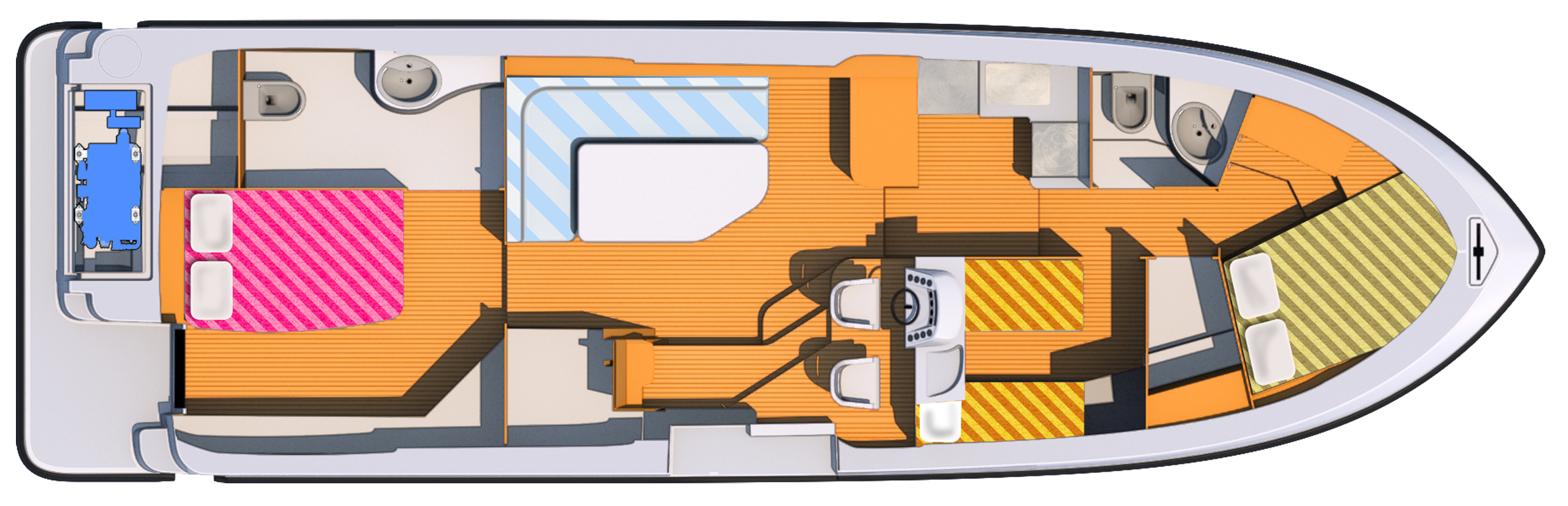 - Cabine avant avec lit double, cabine latérale et cabine arrière avec 2 lits simples convertibles en lit double.