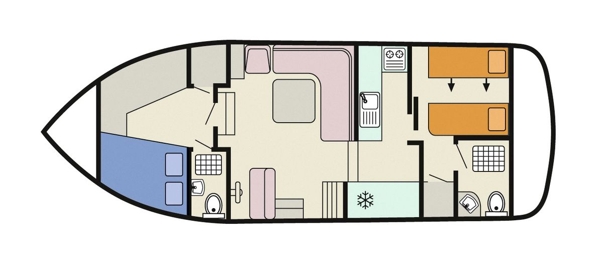 - Cabine avant avec lit double, cabine arrière avec 2 lits simples convertibles en lit double (quelques modèles avec 2 lits superposés).
