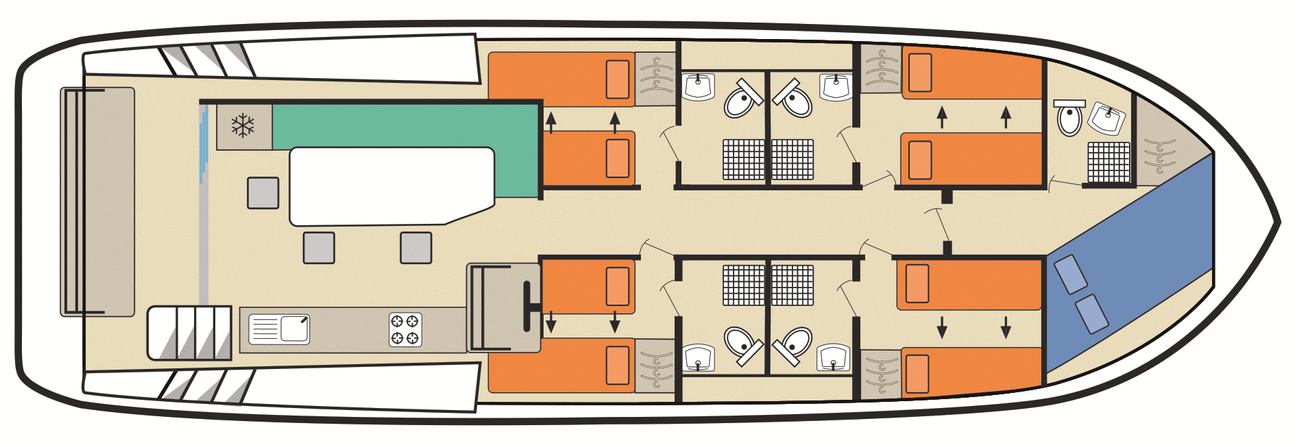 - Petite cabine avant avec lit double; 4 cabines latérales (dont 2 petites), chacune avec 2 lits simples convertibles en lit double.