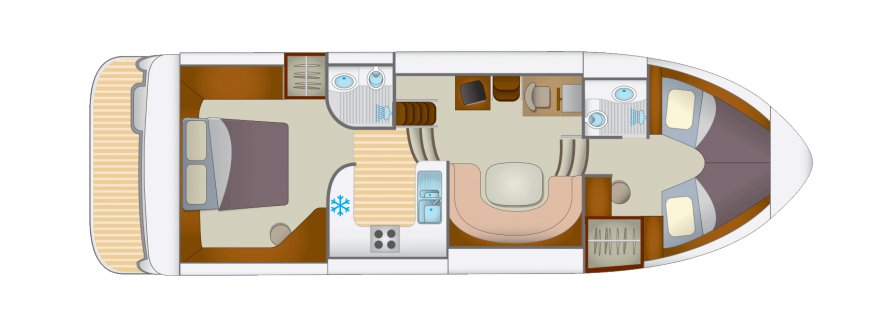 - Cabine avant avec 2 lits simples convertibles en lit double, grande cabine arrière avec lit double.