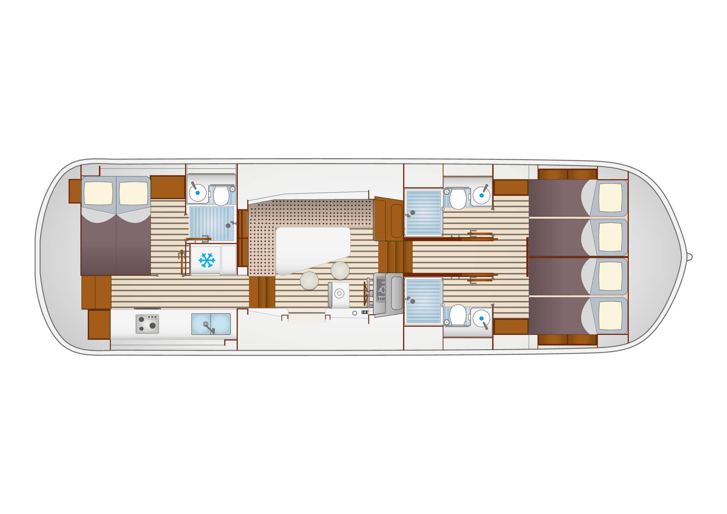 - 3 espaces extérieurs : assise à l’avant du bateau, grand bain de soleil et pont supérieur avec second poste de pilotage équipé d’une plancha à gaz, évier, glacière, bimini et douche extérieure.