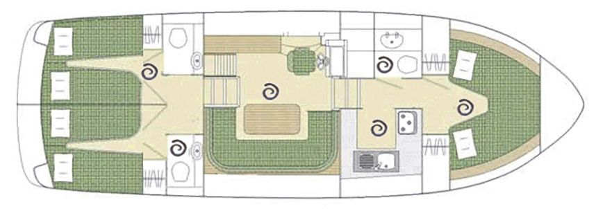 - 3 cabines, chacune avec 2 lits simples convertibles en lit double.
