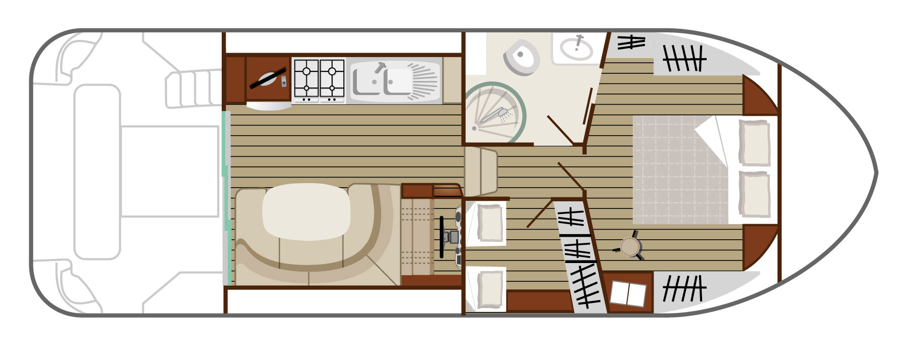 - Propulseur d’étrave, prise de quai, climatisation (à quai) et écran plat avec lecteur DVD.