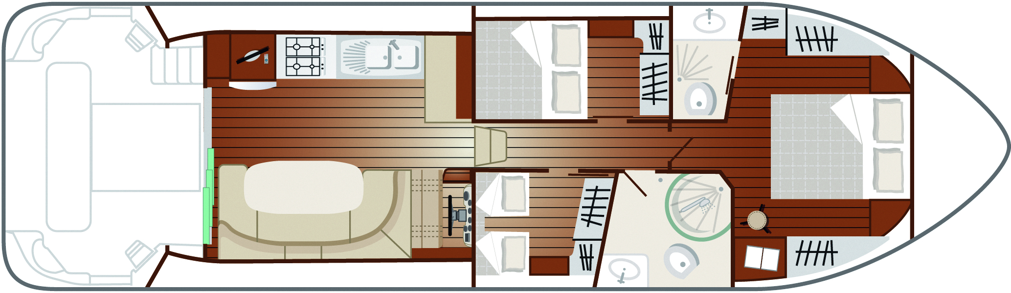 - 3 cabines, dont 2 avec lits doubles et 1 avec 2 lits simples convertibles en lit double.