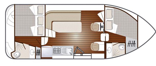 Une conception classique et pratique: des cabines réparties à l’avant et à l’arrière du bateau, séparées par le séjour central, pour un maximum d’intimité. Un accès sécurisé pour aller tant sur la terrasse avant par un couloir moulé dans la coque, que sur la terrasse arrière accessible depuis le séjour.