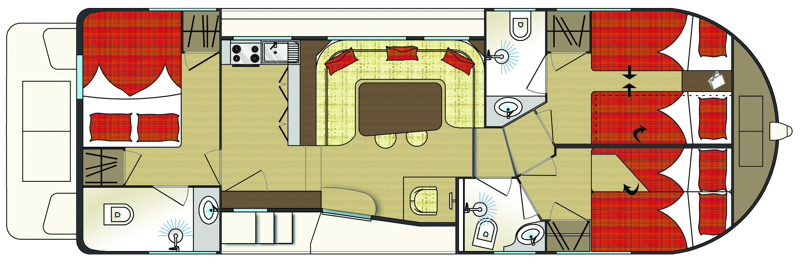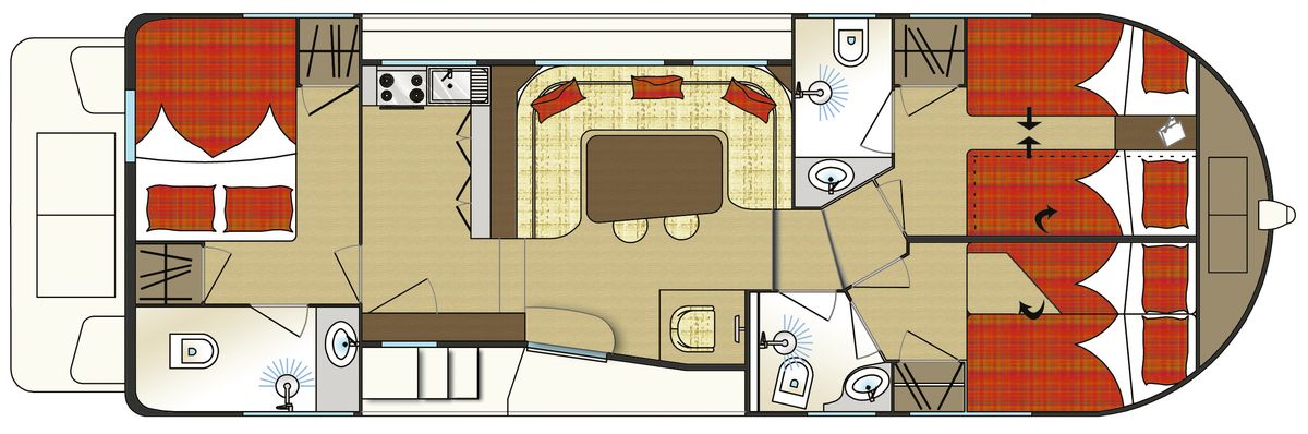 - 2 cabines avant, l’une avec 2 lits simples transformables en lit double (possibilité d’installer une couchette superposée), l’autre avec un lit double convertible en lit simple et cabine arrière avec lit double.
