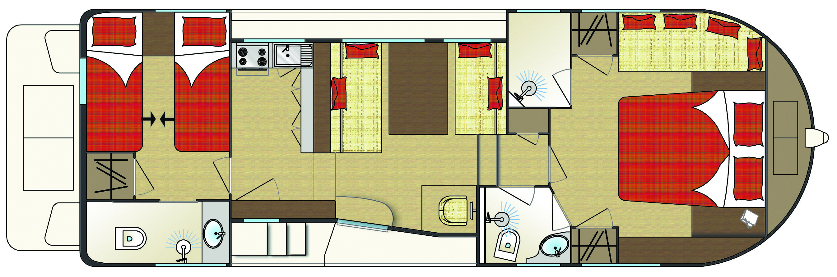 - Spacieuse cabine avant avec lit double et canapé (transformable en lit simple); cabine arrière avec 2 lits simples convertibles en lit double.