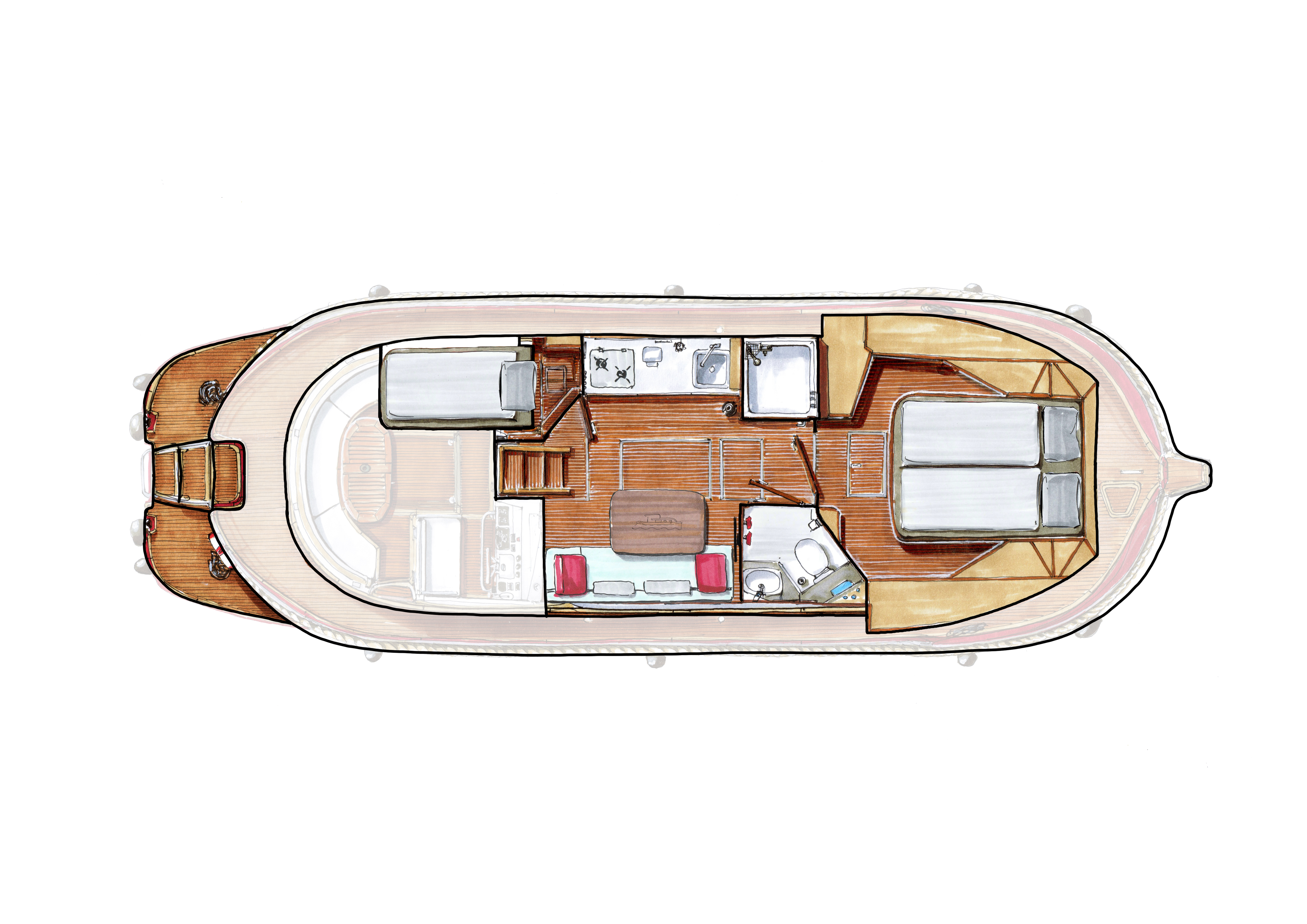 - Cabine avant avec lit double; petite cabine arrière avec lit simple.