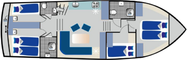 - 2 cabines avant, chacune avec lit double, 2 cabines arrière, l'une avec lit double, l'autre avec lit simple.