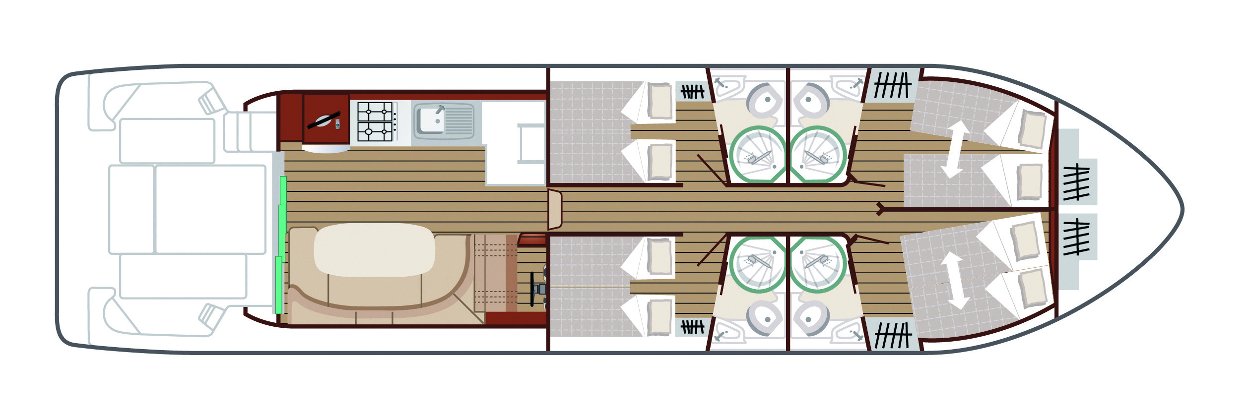 - 4 cabines, chacune avec 2 lits simples convertibles en lit double.