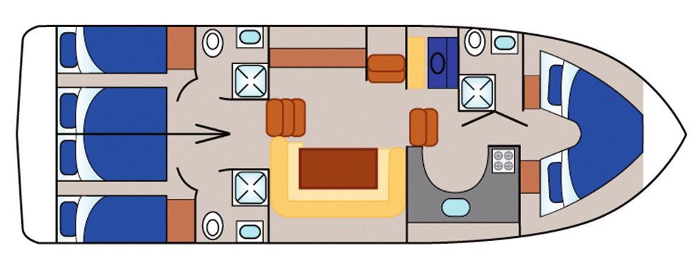 - 3 cabines, chacune avec 2 lits simples convertibles en lit double.