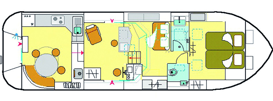 - Au centre, salon transformable en lit double séparé par un rideau; poste de pilotage avec sièges pour l’équipage. A l’arrière, cuisine et belle salle à manger, poêle à bois.